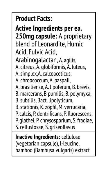Active Ingredients: A proprietary blend of Leonardite, Humic Acid, Fulvic Acid,Arabinogalactan, Shilajit (natural source of C60), A. agilis,A. citreus, A. globiformis, A. luteus, A. simplex, A. calcoaceticus, A. chroococcum, A. paspali, A. brasiliense, A. lipoferum, B. brevis, B. marcerans, B pumilis, B. polymyxa, B. subtilis, Bact. lipolyticum, B. stationis, K. zopfil, M. verrucaria, P. calcis, P. dentrificans, P. fluorescens, P. glathei, P. chrysosporium, S. fradiae, S. celluslosae, S. griseoflavus
