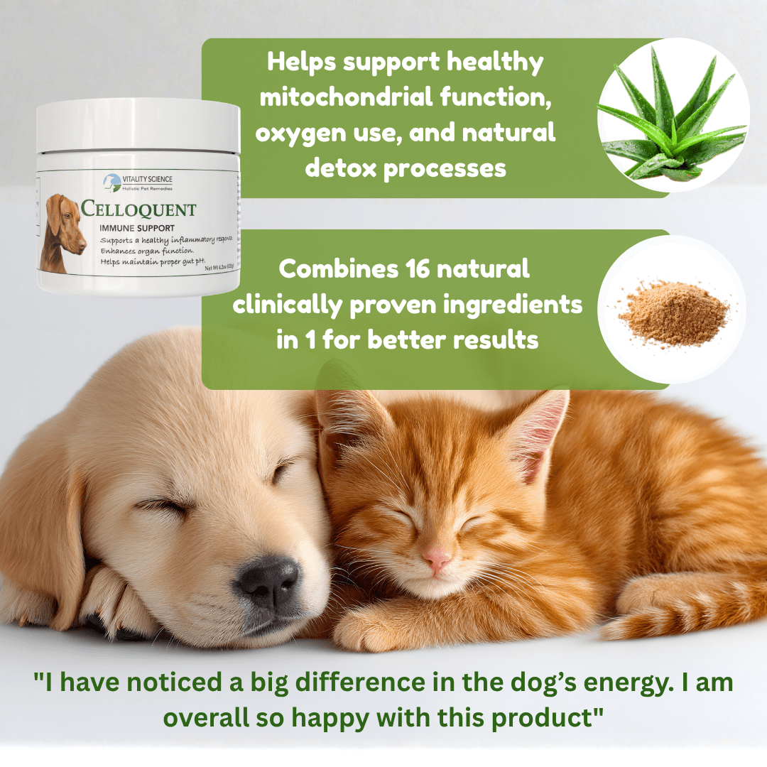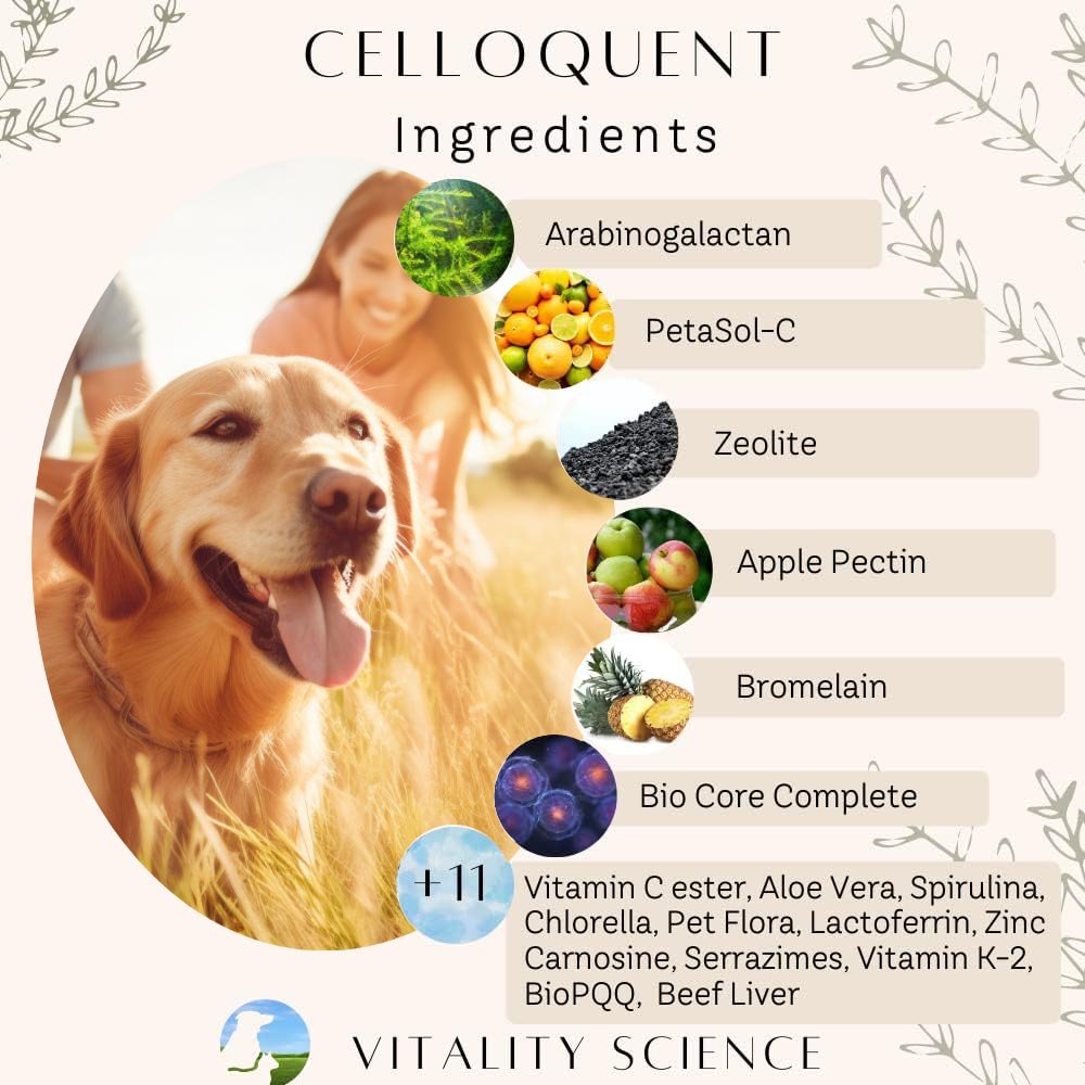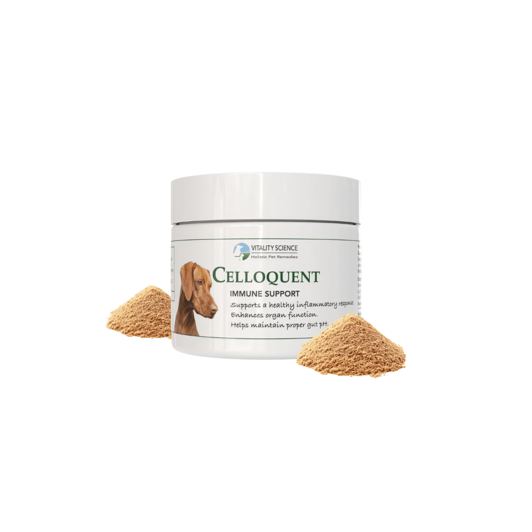 Celloquent is our most powerful immune supporter for dogs. Celloquent enhances mitochondrial production, improves oxygen utilization, and supports detoxification through the use of cutting edge ingredients.
