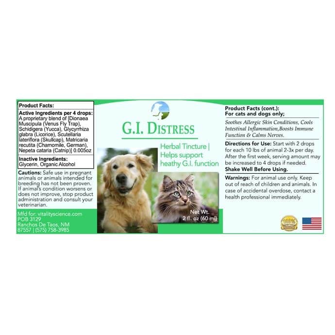 Note: Never put a glass dropper in an animal’s mouth. Add directly to food or dilute with 5 parts water and use with a plastic syringe. When syringing, slowly inject into the side of the animal’s mouth. To achieve optimum effectiveness, administer GI Distress at least one hour separately from other Vitality Science remedies you may be using.
